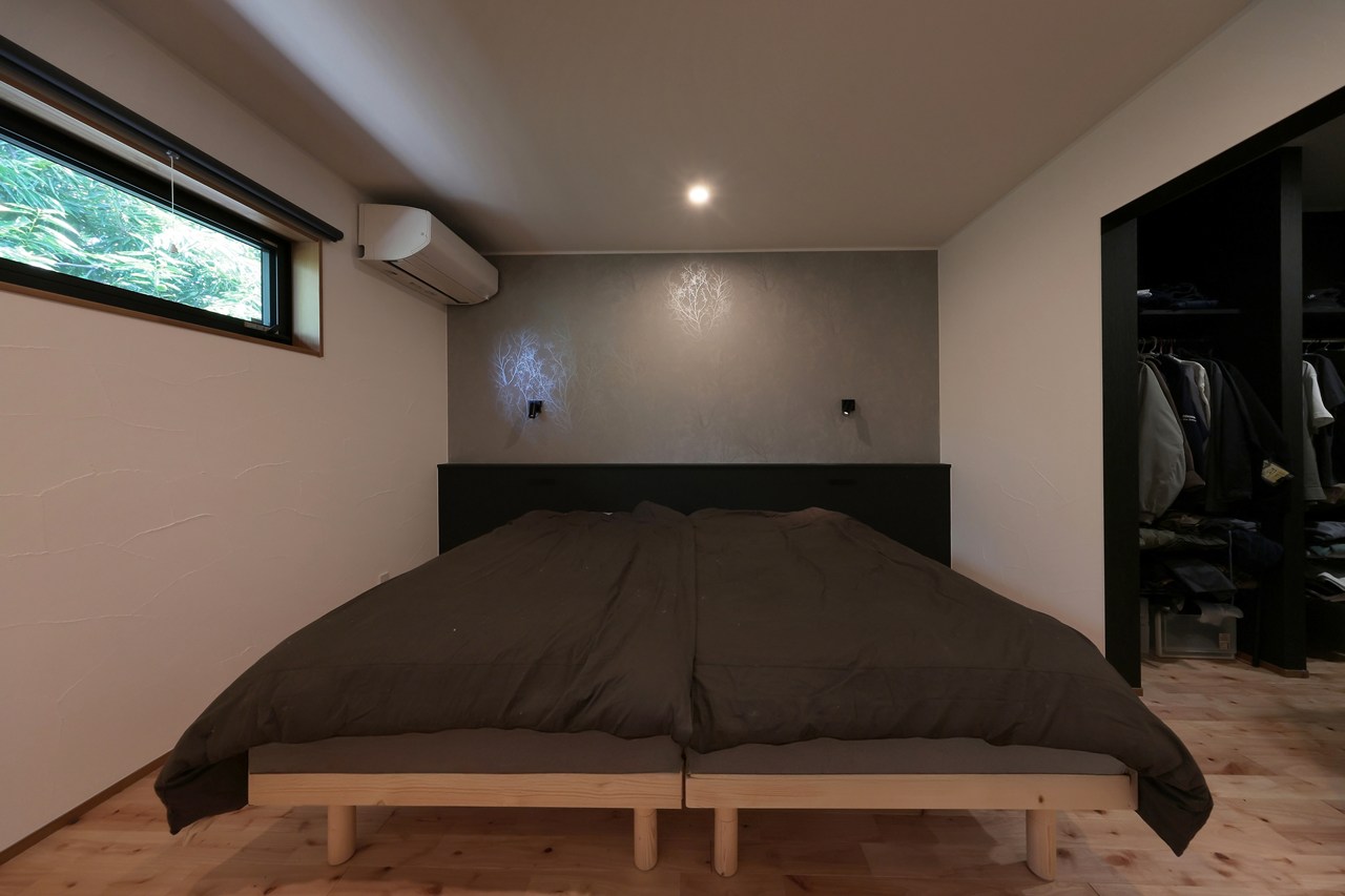 ダークトーンにまとめて、高級感あるホテルライクな寝室に。