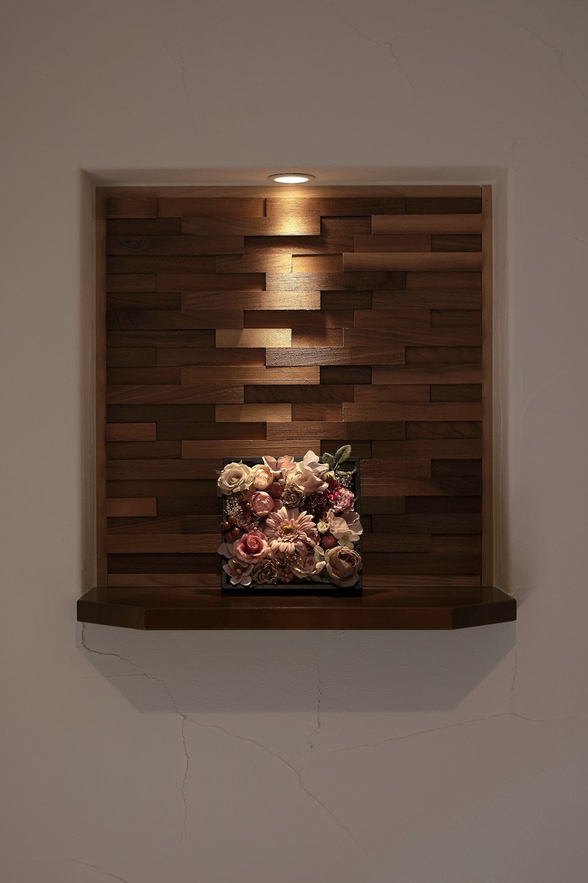 インスタで家づくりについて色々調べていたのですが、そこで見つけたエコカラットをテレビの背面壁に採用しました。照明の感じとも合わさって、落ち着いた空間になりデザイン性も高まりました。