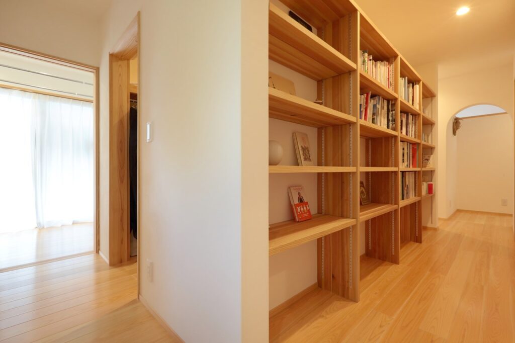 特に沢山の本を収納する本棚や食器などを収納するキッチン背面収納は、壁にしっかりと固定された造作にすることで、地震で倒れてくる心配がなく安心です。棚板の奥行きや高さを、収納したいものののサイズに合わせて決められるため、無駄なスペースなく効率よく収めることが可能。