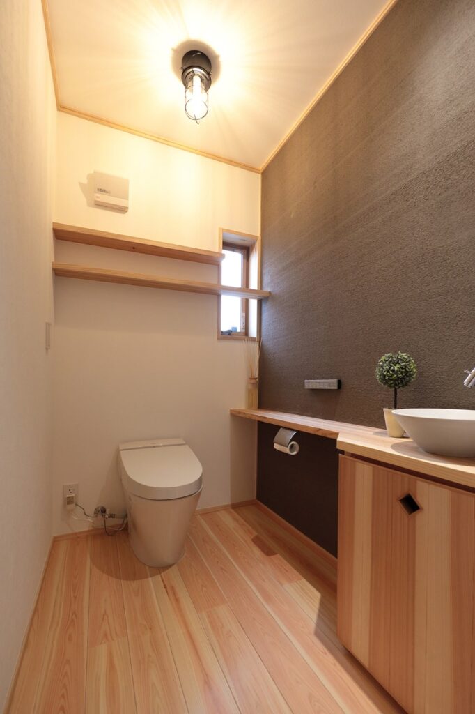 壁の一面をシラス壁で色を変えたり、タイルを貼ったりすることで空間のアクセントに。トイレは比較的小さな空間のため、壁一面をアクセントにしても圧迫感を感じにくく、費用も抑えられます。
