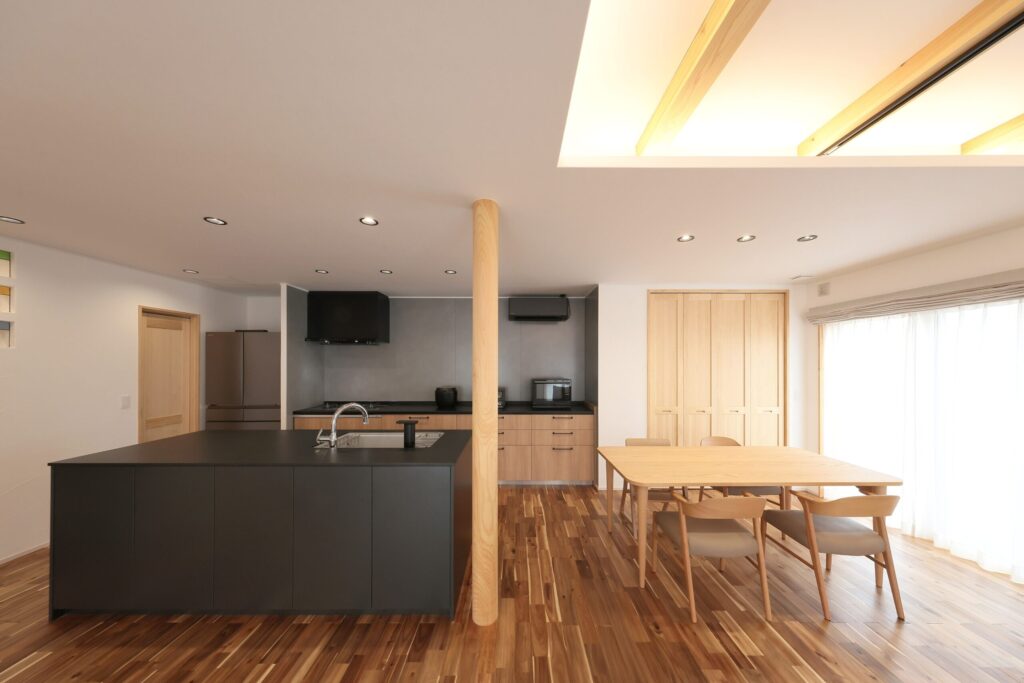 無垢の床だからこその質感が、落ち着くオシャレなインテリアを実現します。子育て中の方にも安心していただけるように、傷つきにくい広葉樹の床を標準採用しています。室内建具も無垢で揃えることで、インテリアの統一感を出しています。