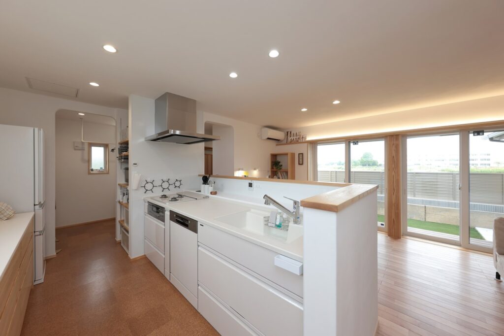キッチンを一周できる回遊動線や、多様な使い方のできるフリースペースもご覧いただけます。
