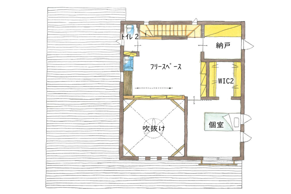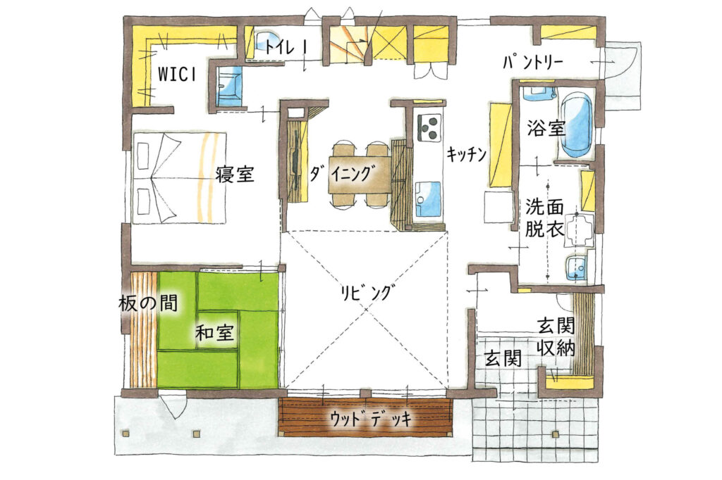 平屋のような使い方もできる1階寝室と、8畳の大きな吹き抜けリビングが見どころのお住まい。