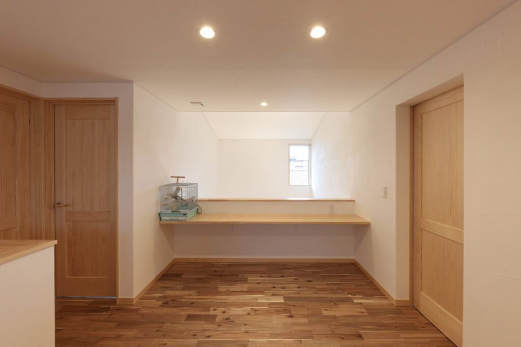 2階のデスクコーナーからは吹き抜けを通してリビングの様子がうかがえます。他にもWICや広々とした物干室、帰宅動線などもご覧いただけます。