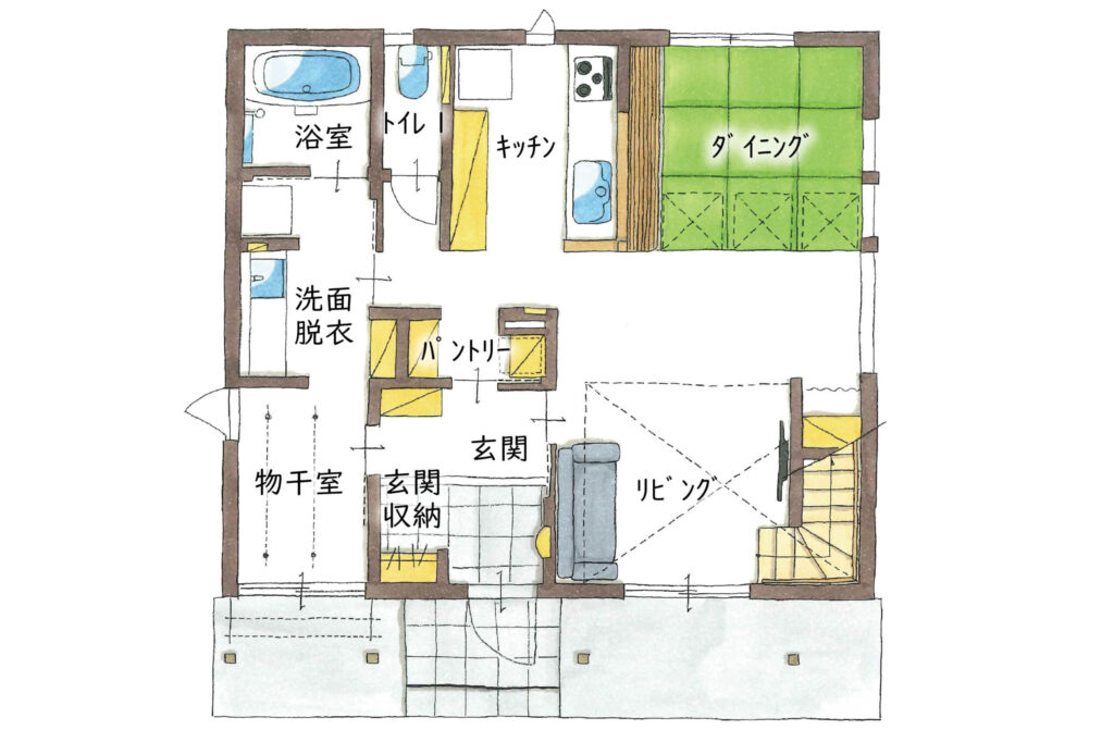 足を伸ばしてくつろげる小上がりの畳ダイニングと、開放感が魅力の吹き抜けのあるリビングが見どころのお住まい。