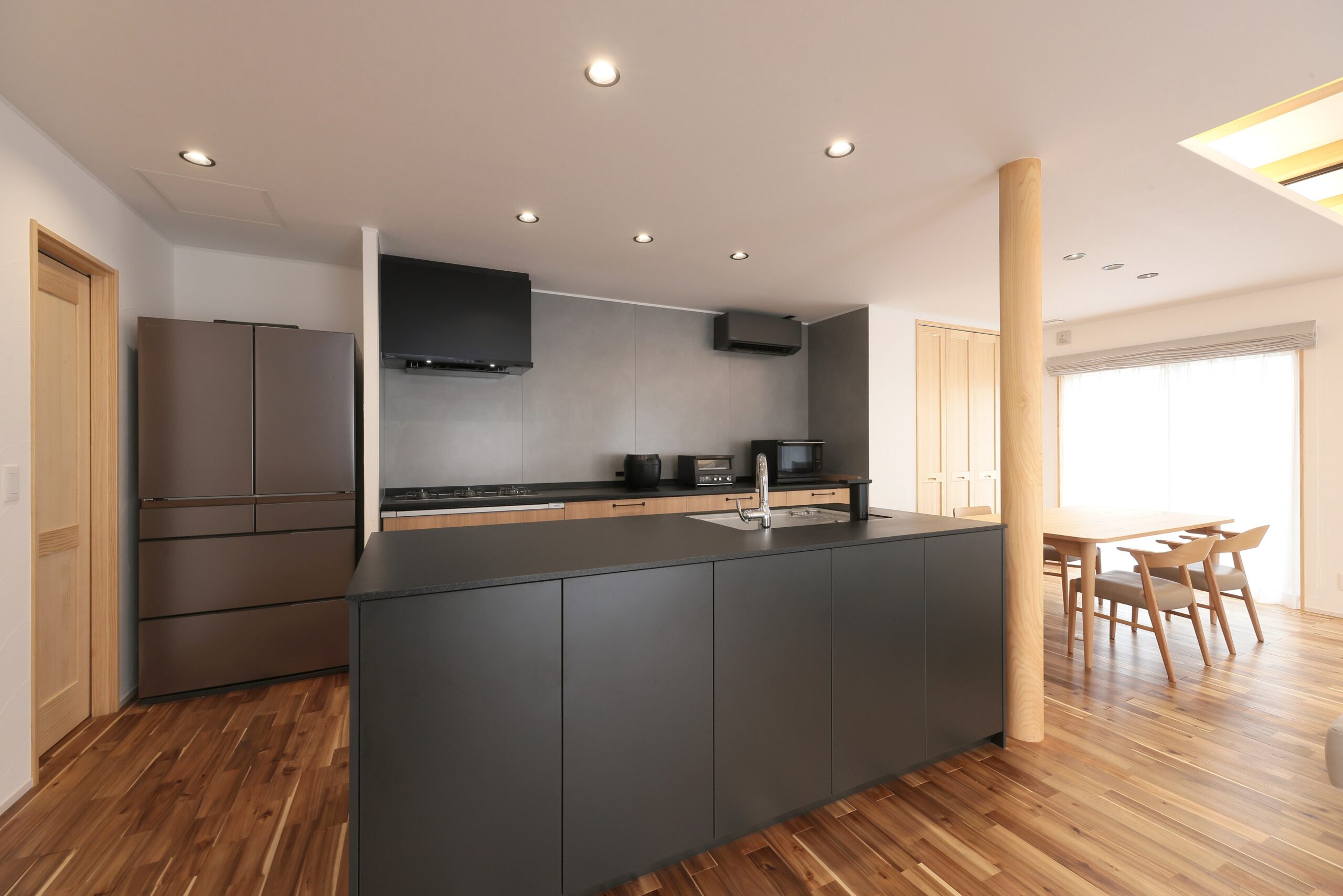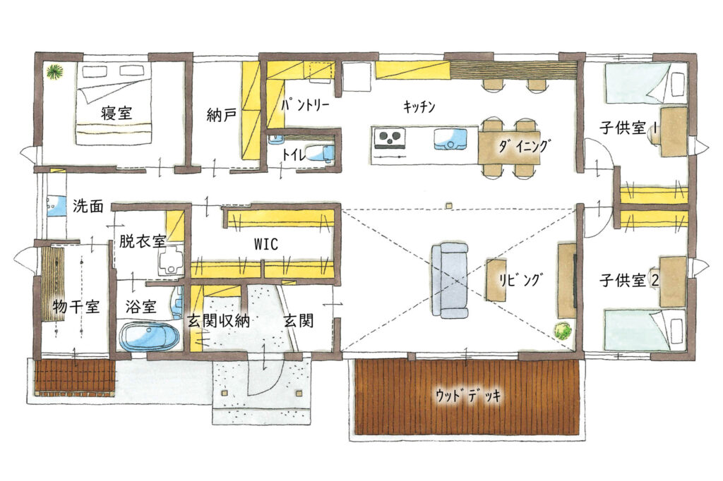 回遊性のあるキッチンや斜め天井のリビング、ウッドデッキにより開放的なLDKが魅力のお住まい。
